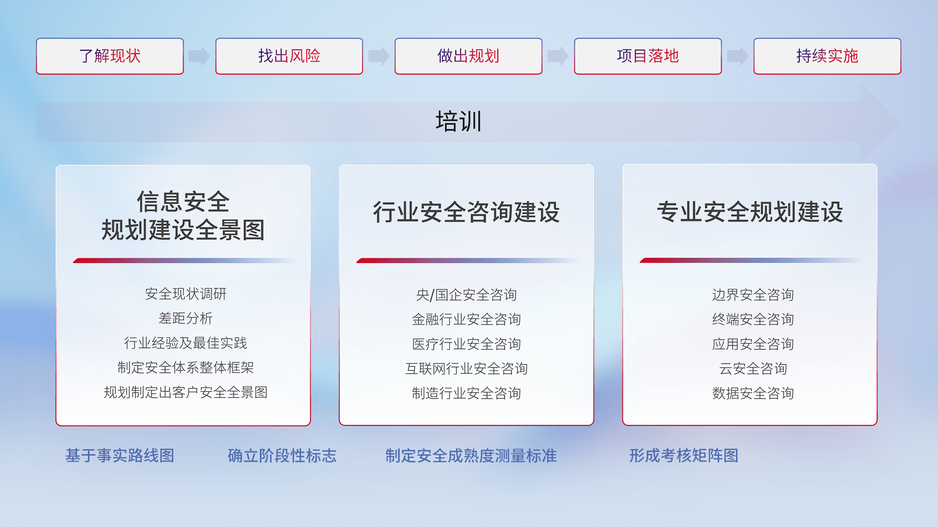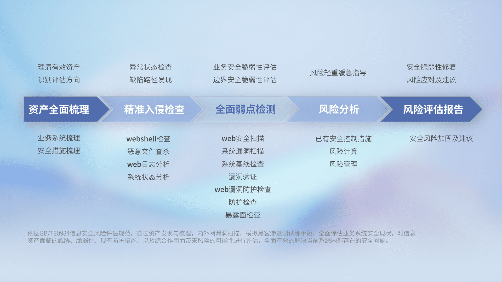 针对客户行业特性,,,以专业的安全服务+多厂商联合解决方案提供专属的一站式安全管理服务,,,帮助客户全面感知网络空间威胁,,,,基于识别、、、、检测、、、、分析、、、、防护、、监测、、响应的服务理论模型,,,从方案咨询、、、、集成交付、、、评估验证、、、优化加固、、、、运维运营,,致力于为客户提供完整的闭环管理式安全服务。。以实战经验为客户打造高抵御风险的安全体系,,,,帮助客户发现威胁、、、、对抗威胁、、、处置威胁,,,不断积累安全对抗能力,,,持续保障数字化安全。。。