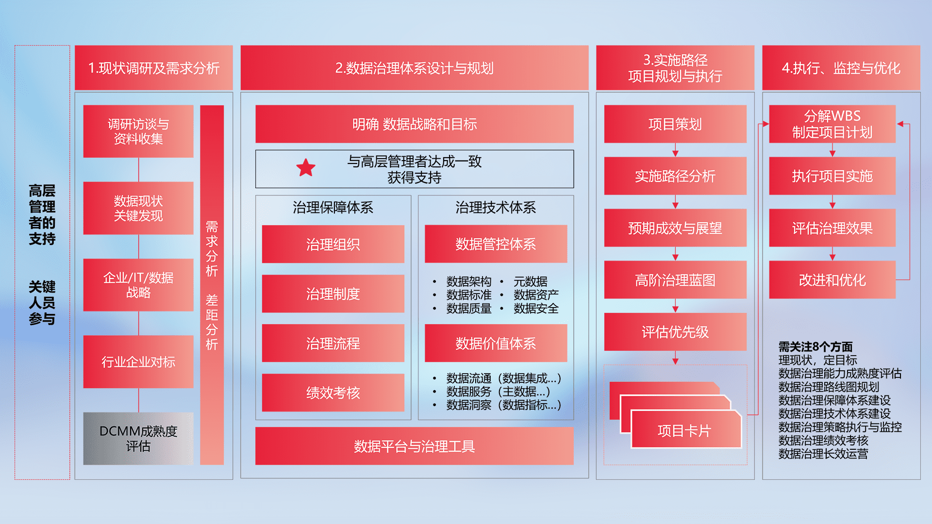 企业缺乏统一的数据顶层战略规划和系统化的数据治理体系,,,未建立健全的数据管理机制与体系,,,,导致数据管理碎片化,,无法有效支撑企业的长远发展和数字化转型目标。。
